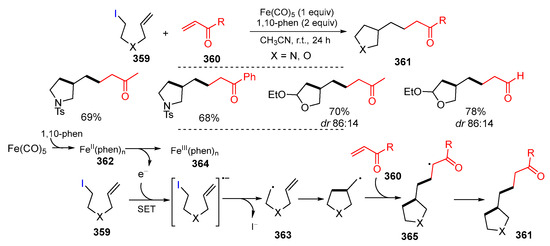 - Hwang, J.Y.; Baek, J.H.; Shin, T.I.; Shin, J.H.; Oh, J.W.; Kim, K.P.; You, Y.; Kang, E.J. Single-electron-transfer strategy for reductive radical cyclization: Fe(CO)5 and phenanthroline system. Org. Lett. 2016, 18, 4900–4903. [Google Scholar] [CrossRef] [PubMed]