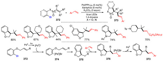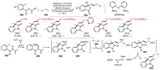 - Li, P.-S.; Teng, Q.-Q.; Chen, M. Photoinduced radical cascade domino Heck coupling of N-aryl acrylamide with vinyl arenes enabled by palladium catalysis. Chem. Commun. 2023, 59, 10620–10623. [Google Scholar] [CrossRef] [PubMed]