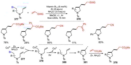 - Smoleń, S.; Wincenciuk, A.; Drapała, O.; Gryko, D. Vitamin B12-catalyzed dicarbofunctionalization of bromoalkenes under visible light irradiation. Synthesis 2021, 53, 1645–1653. [Google Scholar] [CrossRef]
