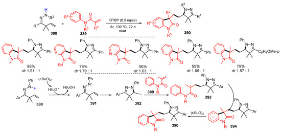 - Duan, X.-Y.; Yang, X.-L.; Jia, P.-P.; Zhang, M.; Han, B. Hydrazonyl radical-participated tandem reaction: A strategy for the synthesis of pyrazoline-functionalized oxindoles. Org. Lett. 2015, 17, 6022–6025. [Google Scholar] [CrossRef] [PubMed]