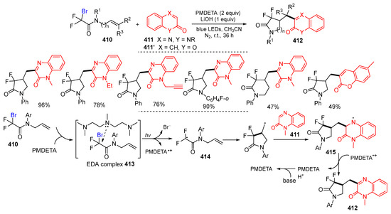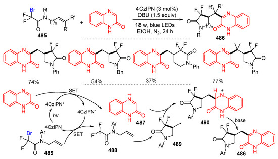 - Zhao, W.; Xuan, L.; Liu, Y.; Yin, J.; Wang, H.; Yan, Q.; Wang, W.; Huang, J.; Chen, F. Photoinduced tandem radical cyclization/heteroarylation of N-allylbromodifluoroacetamides with quinoxalin-2(1H)-ones or coumarins under metal- and photocatalyst-free conditions. New J. Chem. 2023, 47, 10744–10750. [Google Scholar] [CrossRef]