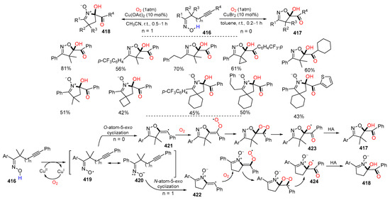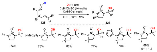 - Liu, X.-D.; Wang, Q.-A.; Zhu, Y.-P.; Peng, Z.-H.; Li, J.-H. Copper-catalyzed aerobic hydroxyamination of alkenes of unsaturated keto oximes in EtOH toward cyclic nitrones. Green Chem. 2022, 24, 2476–2482. [Google Scholar] [CrossRef]