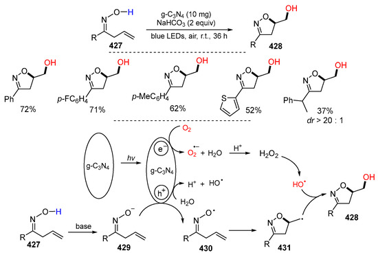 - Fu, X.-Y.; Si, Y.-F.; Qiao, L.-P.; Zhao, Y.-F.; Chen, X.-L.; Yu, B. Visible light-promoted recyclable carbon nitride-catalyzed dioxygenation of β,γ-unsaturated oximes. Adv. Synth. Catal. 2022, 364, 574–580. [Google Scholar] [CrossRef]