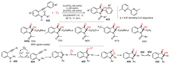 - Sun, W.; Cui, X.; Qu, J.; Cai, X.; Hu, J.; Xiong, Z.; Guo, S.; Xu, J.; Chen, W.-H.; Wu, J.-Q. Facile access to 2-hydroxy-2-substituted indole-3-ones via a copper-catalyzed oxidative cyclization of 2-arylethynylanilines. Chem. Commun. 2023, 59, 7228–7231. [Google Scholar] [CrossRef]