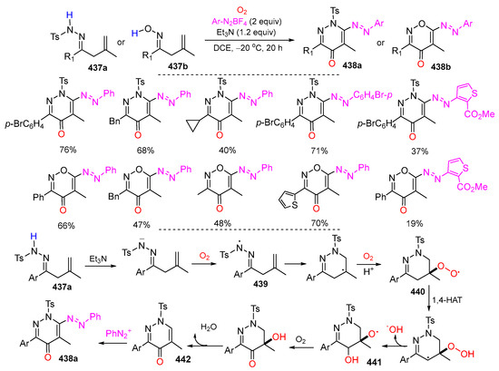 - Qi, Z.; Wen, S.; Liu, Z.; Jiang, D. Oxygen-promoted 6-endo-trig cyclization of β,γ-unsaturated hydrazones/ketoximes with diazonium tetrafluoroborates for pyridazin-4(1H)-ones/oxazin-4(1H)-ones. Org. Lett. 2023, 25, 6110–6115. [Google Scholar] [CrossRef]