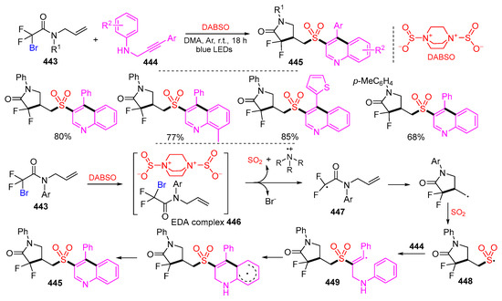 - Ye, H.; Zhou, L.; Chen, Y.; Tong, H. Visible light driven multicomponent synthesis of difluoroamidosulfonyl quinoline derivatives. Org. Biomol. Chem. 2023, 21, 846–850. [Google Scholar] [CrossRef] [PubMed]