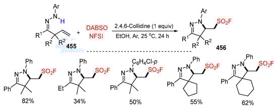 - Yan, Z.-M.; Qi, L.; Cao, T.-Y.; Liu, J.-L.; Du, H.-J.; Dong, Y.-C.; Li, W.; Wang, L.-J. Aminofluorosulfonylation of β,γ-unsaturated hydrazones with sulfur dioxide and N-fluorobenzenesulfonimide: Accessing pyrazoline-functionalized aliphatic sulfonyl fluorides. Org. Lett. 2023, 25, 3910–3915. [Google Scholar] [CrossRef] [PubMed]