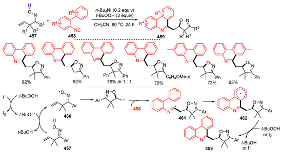 - Yang, X.-L.; Chen, F.; Zhou, N.-N.; Yu, W.; Han, B. Synthesis of isoxazoline-functionalized phenanthridines via iminoxyl radical-participated cascade sequence. Org. Lett. 2014, 16, 6476–6479. [Google Scholar] [CrossRef] [PubMed]