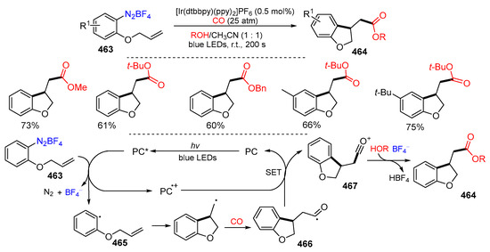- Micic, N.; Polyzos, A. Radical carbonylation mediated by continuous-flow visible-light photocatalysis: Access to 2,3-dihydrobenzofurans. Org. Lett. 2018, 20, 4663–4666. [Google Scholar] [CrossRef] [PubMed]
