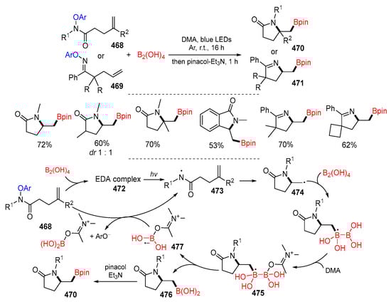 - Zheng, D.; Jana, K.; Alasmary, F.A.; Daniliuc, C.G.; Studer, A. Transition-metal-free intramolecular radical aminoboration of unactivated alkenes. Org. Lett. 2021, 23, 7688–7692. [Google Scholar] [CrossRef] [PubMed]