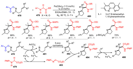- Yu, F.; Yang, S.; Xie, Z.; Lu, D.; Gong, Y. An iron-catalysed radical cyclization/C(sp3)–H alkylation cascade between γ,δ-unsaturated oxime esters and glycine derivatives: Access to pyrroline-containing amino acids. Org. Chem. Front. 2023, 10, 382–387. [Google Scholar] [CrossRef]