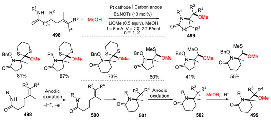 - Quertenmont, M.; Toussaint, F.C.; Defrance, T.; Lam, K.; Markó, I.E.; Riant, O. Continuous flow electrochemical oxidative cyclization and successive functionalization of 2-pyrrolidinones. Org. Process Res. Dev. 2021, 25, 2631–2638. [Google Scholar] [CrossRef]