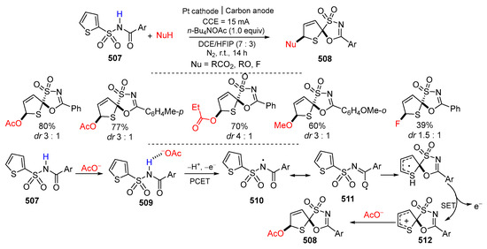 - Shi, Z.; Wang, W.-Z.; Li, N.; Yuan, Y.; Ye, K.-Y. Electrochemical dearomative spirocyclization of N-acyl thiophene-2-sulfonamides. Org. Lett. 2022, 24, 6321–6325. [Google Scholar] [CrossRef] [PubMed]
