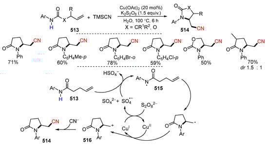 - Liu, W.; Wang, L.; Mu, H.; Zhang, Q.; Fang, Z.; Li, D. Synthesis of cyano-substituted γ-lactams through a copper-catalyzed cascade cyclization/cyanation reaction. Org. Biomol. Chem. 2023, 21, 1168–1171. [Google Scholar] [CrossRef] [PubMed]