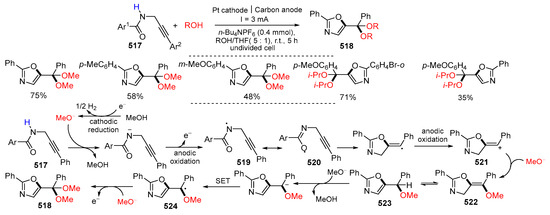 - Zhang, H.; Xiong, Y.; Luo, M.-J.; Yang, R.; Bai, J.; Song, X.-R.; Xiao, Q. Metal-free electrochemical oxidative intramolecular cyclization of N-propargylbenzamides: Facile access to oxazole ketals. Org. Chem. Front. 2023, 10, 3786–3791. [Google Scholar] [CrossRef]