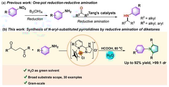 Metal-catalyzed transfer hydrogenation employed as a supplement to conventional hydrogenation drew much attention and was extensively utilized in organic synthesis [47]. In this context, hydrogen donors such as formic acid were widely utilized in differential transfer hydrogenation reactions owing to their potential hydrogen storage, low toxicity, as well as ease of handling [48]. We have great interest in transfer hydrogenation and conducted a series of relative studies using iridium complexes as catalysts [49], by which reduction in unsaturated compounds [50,51], silane oxidation [52], N-allylic alkylation [53], reductive amination [54], reductive amination [55], as well as reductive etherification [56] were reported. Recently, we established a one-pot procedure for synthesizing amines via reduction-reductive amination (Scheme 2a) [57]. Based on previous work, we envisioned that this approach could also be employed for the construction of N-aryl-substituted pyrrolidines via successive reductive amination. Herein, we describe an iridium-catalyzed successive reductive amination of diketones with anilines, offering N-aryl-substituted pyrrolidines in good to excellent yields under mild conditions (Scheme 2b). This protocol provides a new route for azacycle synthesis.
