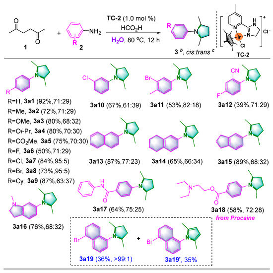 With the above optimized conditions in hand, differentially substituted aromatic amines were explored for the synthesis of N-aryl-substituted pyrrolidines using 2,5-hexanedione (1a) as substrate. As showcased in Scheme 3, para-substituted aromatic amines with different electronic effects and positions were well tolerated in this system, affording the desired products of 3a2–3a9 in moderate to excellent yields and stereoselectivities. Notably, reductive amination of 2,5-hexanedione (1a) with 2-naphthylamine (2m), 5,6,7,8-tetrahydro-naphthalen-2-amine (2n), 2,3-dihydro-1H-inden-5-amine (2o), 1-methylindolin-6-amine (2p), as well as 4-amino-N-phenylbenzamide (2q) also produced the corresponding N-aryl-substituted pyrrolidines 3a13–3a17 in moderate yields and stereoselectivities. Interestingly, similar yield and stereoselectivity of the procaine-derived pyrrolidine 3a18 were afforded as well by using procaine as a nucleophile. However, both pyrrolidine (3a19) and pyrrole (3a19′) products were formed simultaneously in similar yield with 5-bromonaphthalen-1-amine (2s) as substrate.
