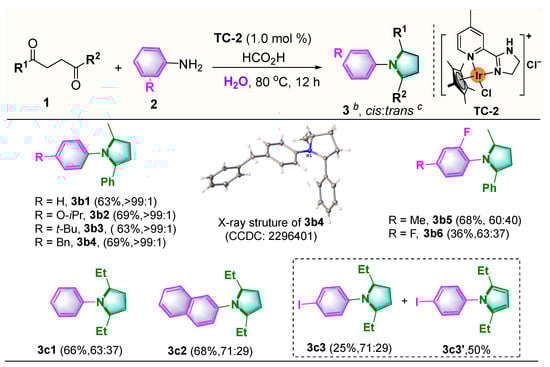 To further explore the practicability of this catalytic system, the scope of diketones for this reductive amination with different aromatic amines was screened as well. As shown in Scheme 4, similar moderate yields but excellent stereoselectivities (>99:1 dr) of N-aryl-substituted pyrrolidines (3b1, 3b2~3b4) were afforded via reductive amination of 1-phenylhexane-1,4-dione (1b) with para-substituted aromatic amines, in which the configuration of 3b4 was determined by X-ray crystallography [58]. However, decreased stereoselectivities of the desired product (3b5, 3b6) were observed using ortho- and para-substituted aromatic amines as nucleophiles and 1-phenylhexane-1,4-dione (1b) as substrate. Obviously, employing more steric hinderance of octane-3,6-dione (1c) as substrate resulted in similar moderate yields and stereoselectivities (3c1 and 3c2). Surprisingly, the formation of pyrrole as a major product (3c3′) was observed by using 4-iodoaniline (2y) as a nucleophile, delivering a reductive amination product of 3c3 in lower yield.