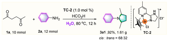 Despite the great progress achieved in the construction of N-aryl-substituted pyrrolidines, challenges still exist in terms of selectivity, substrate versatility, reaction conditions, as well as catalytic efficiency [45,46]. Among the general strategies for pyrrolidine synthesis, reductive amination is undoubtedly the most efficient approach. In this process, the reaction of carbonyl compounds with amines took place first to afford C=N intermediates, which was then followed by the reduction process to form C-N bonds, in which water is the only by-product. Nevertheless, an excess of expensive hydrides or silanes was generally required as a reductant in these traditional processes [16,17,18,19,20,21,22,23]. Therefore, a cheap and efficient catalytic system is still in demand for pyrrolidine synthesis.
