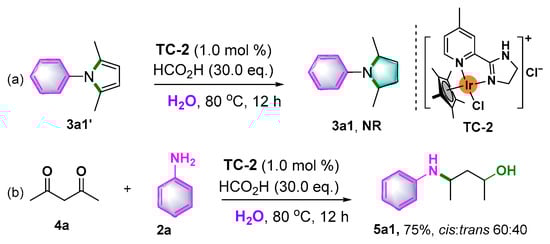 To shed light on the process of this Ir-catalyzed reductive amination, control experiments were conducted to explore more details of this transformation. Firstly, to probe whether the pyrrole is involved as an intermediate in this reductive amination process, a control experiment using 3a1′ as substrate was performed under standard conditions (Scheme 6a). However, no expected pyrrolidine product 3a1 was observed, strongly suggesting that the pyrrolidine product was not produced via the transfer hydrogenation of pyrrolidine.