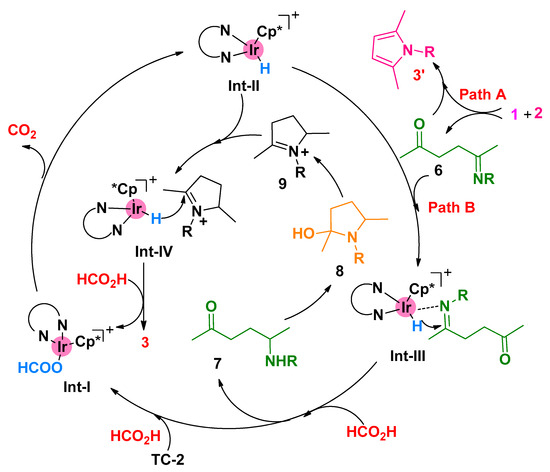 Based on the experimental results and related studies [16,55,57], a possible process of this Ir-catalyzed successive reductive amination was proposed in Scheme 7. Comparative pathways took place in the presence of diketones and amines under these standard conditions. On the one hand, the Paalknorr condensation took place to deliver the pyrrole product of 3′ (Path A) [59]. On the other hand, the imidone intermediate 6 was formed firstly via condensation, which was reduced to afford the amino ketone 7 via transfer hydrogenation under the action of iridium catalysts (Path B). Using amino ketone 7 as material, a more similar condensation and transfer hydrogenation were undergone to produce the pyrrolidine product 3. In this process, we envisaged that the stable five-membered ring intermediate 9 was crucial to deliver the corresponding pyrrolidine product, which was supported by the formation of amino alcohol 5a1, rather than the four-membered ring product using pentane-2,4-dione (4a) as substrate (Scheme 6b).