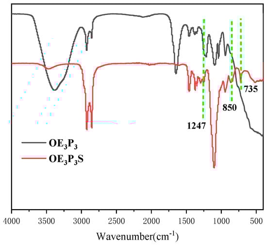 The FT-IR spectra of OE3P3S and its raw material oleyl polyoxyethylene polyoxypropylene ether (OE3P3) are shown in Figure 1. Compared with OE3P3, E3P3S shows a symmetrical stretching vibration adsorption peak for S=O bond at 1247 cm−1 and stretching vibration absorption peaks for C-O-S at 850 cm−1 and 735 cm−1, indicating that the sulfation reaction occurred.