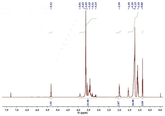 OE3P3S was synthesized according to Reference [46]. During the reaction process, the molar ratio of OE3P3 to SA was 1:1.2, SA to urea was 1:0.53, the amount of solvent (DMF) added was 35% of the total reaction material, the reaction temperature was maintained at 100 °C, and the reaction time was 3 h until the end of the sulfation reaction. The reaction mixture was adjusted to pH = 9–10 using 4% NaOH to neutralize the reaction. For detailed purification methods, please refer to [14]. A viscous yellow sample was obtained, and the yield was 92.10%. The sulfation reaction was confirmed using FT-IR (Thermo Scientific Nicolet iS20). The molecular structure of OE3P3S was confirmed using 1H NMR (Bruker 600 M, Billerica, MA, USA) in CDCl3. The general molecular formulas of OE3P3S and ATAB are illustrated in Scheme 2.