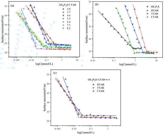 γ-logC curves of aqueous surfactant solutions at 298 K. (a) Binary system of OE3P3S/CTAB with different molar ratios; (b)single system; (c) binary system of OE3P3S/ATAB = 6:4.