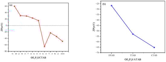 Variation in zeta potential of OE3P3S/ATAB at 0.01 mmol/L. (a) OE3P3S/CTAB with different molar ratios; (b) OE3P3S/ATAB = 6:4.