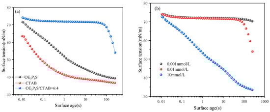 The curve of dynamic surface tension over surface age at 298 K. (a) Sodium oleyl polyoxyethylene polyoxypropylene ether sulfate (OE3P3S), CTAB, and OE3P3S/CTAB = 6:4 mixture at 0.01mmol/L; (b) OE3P3S/CTAB = 6:4 mixture at 0.001, 0.01, and 10 mmol/L.
