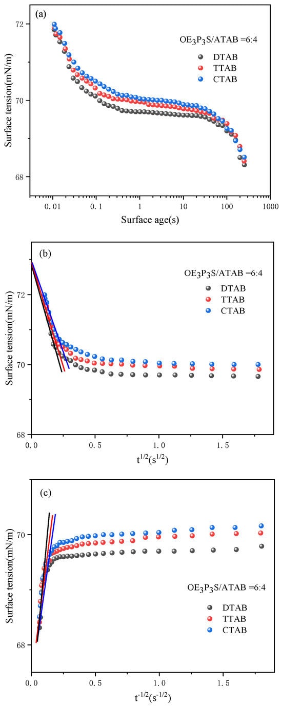 Dynamic surface tension of aqueous OE3P3S/ATAB = 6:4 mixtures as a function of (a) the surface age, (b) short time (t1/2), and (c) long time (t−1/2). The OE3P3S/ATAB = 6:4 mixture concentration was fixed at 0.01 mmol/L. DTAB (black line), TTAB (red line), CTAB (blue line).