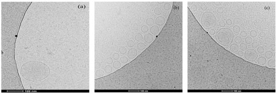 Electron microscope images obtained from cryo-TEM (Figure 8) showed that vesicles formed in OE3P3S/ATAB solutions at a mixing ratio of 6:4 with a concentration of 0.05 mmol/L. The size distribution of the vesicles for OE3P3S/DTAB determined using cryo-TEM was in the range between 16 and 416 nm, while the size distributions of the vesicles for OE3P3S/TTAB and OE3P3S/CTAB were from 59 to 167 nm and from 74 to 133 nm. As can be seen in Figure 8, OE3P3S/DTAB possesses the smallest aggregate, while OE3P3S/TTAB and OE3P3S/CTAB have larger aggregates with a similar size. This situation is in agreement with that observed in the respective DLS measurement. However, the average size of the systems is much smaller than that determined using DLS. This may be interpreted by the formation of clusters due to the large quantity of vesicles in OE3P3S/ATAB solutions and the swollen state during the DLS measurement.