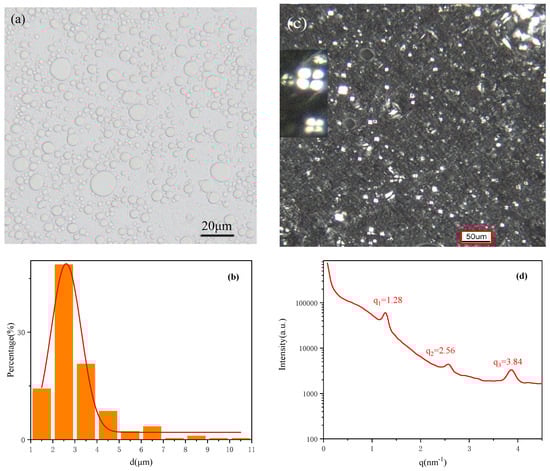 Liquid crystals possess both liquid and solid properties simultaneously, because they are more organized than liquids but less than solids [34], which makes them appealing for cosmetic use. Among other superiorities, lamellar liquid crystals are similar to the lipidic structure of the stratum corneum, and they have a great skin hydration potential [35,36]. Moreover, liquid crystals can take part in the emulsion stabilization process [37]. Figure 9a displays the droplet image of an emulsion formed by OE3P3S with cetearyl alcohol, liquid paraffin, and water. The micrograph of the emulsion under a bright field depicts the shape of the acquired oil droplets as being spherical and homogeneous. The results of the particle size distribution analysis using Nano Measurer 1.2 software are complementary to the microscopic observations. As demonstrated in Figure 9b, the size of the emulsion droplets was mainly distributed at 2.61 ± 0.03 µm. The polarized light micrograph in Figure 9c shows that the oil-in-water emulsion is birefringent. Specific textures combined with Maltese crosses indicate the presence of lamellar phases in the system [38,39,40]. The SAXS analysis in Figure 9d shows three obvious scattering peaks, with q values of 1.28, 2.56, and 3.84 nm−1, respectively. The scattering factor ratio was q1:q2:q3 = 1:2:3, which confirmed the lamellar liquid crystal phase behavior of the emulsion [41]. The apparent diffraction peak at q2 demonstrates the long-range ordering of the liquid crystal structure to make the emulsion less prone to agglomeration and flocculation [40]. The presence of the liquid crystal structure could also typically weaken the van der Waals gravitational force between droplets simultaneously, reducing the aggregation behavior of the droplets and leading to the emulsion being more stable [42].