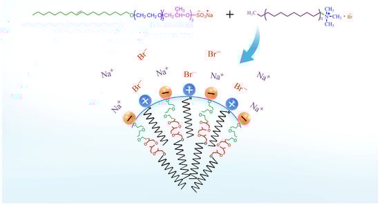 The function of a single surfactant is often not ideal in most cases, and two or more surfactants are usually used in combination to provide a more effective performance and obtain excellent synergies [8]. It has been widely noted that synergism increases with the degree of charge difference; thus, the cationic/anionic surfactant mixtures could gain the highest level of synergism [9]. Accordingly, focused attention on the interfacial properties, structural transformations, and phase behaviors were paid to develop an improved understanding of the synergies between cationic/anionic surfactant mixtures in recent years. For example, experiments by Li and coworkers indicated that the critical micelle concentrations for mixtures of bisquaternary ammonium salt (BQAS) and sodium dodecyl sulfate (SDS) are two orders of magnitude lower than those of either component, and the formation of micelles is an exothermic and entropy increase process [10]. Wang et al. investigated the surface and interfacial properties of mixtures of bisquaternary ammonium salts (16–4–16) and sodium dodecyl benzene sulfonate (SDBS) [9]. Their results showed that the cationic Gemini surfactant 16–4–16 exhibited a strong synergistic effect with SDBS, and the adsorption time, temperature, and liquid–solid ratio had less effect on the IFT of the SDBS/16–4–16 mixture (αSDBS = 0.4) than the cationic surfactant 16–4–16. Zhou et al. studied the effects of sodium thiocyanate (NaSCN) on the mixed decyltriethylammonium bromide and sodium decylsulfonate (C10NE–C10SO3) [11]. The results indicated that the electrostatic attraction between the oppositely charged head groups in the micellar solution of C10NE–C10SO3 was significantly reduced by NaSCN, and the addition of NaSCN could significantly induce a decrease in the aggregate size of C10NE–C10SO3.