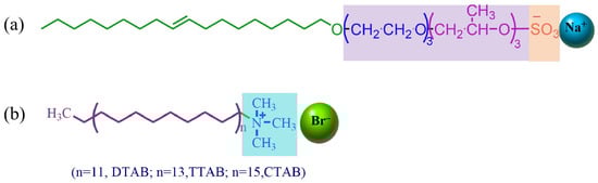 Extended surfactants are unique surfactants that contains intermediate polarity groups such as polypropylene oxide (PO) or polypropylene oxide–polyethylene oxide (PO–EO) between the hydrocarbon tail and hydrophilic head group of conventional surfactants [1]. It is reported that extended surfactants possess better interfacial properties and greater salt and temperature tolerances [2,3,4]. Chen and coworkers found that extended surfactants (n-CcPpS), due to both their rugby-shaped molecular geometry and the dynamic amphipathicity of the PPO spacer, behaved with excellent interfacial and solution properties for household cleaning [5]. Wang et al. proved that a sufficient PO number and low EO number were prerequisites for obtaining ultralow IFT for the extended surfactants, and electrolytes showed little effect on the IFTs of extended surfactants with a “dumbbell” conformation at the interface, because the size of the linear EO group plays a crucial role [2]. Du et al. investigated the effects of PO groups on the wetting properties of C12PO4S and C12PO11S solutions on polytetrafluoroethylene (PTFE) surfaces. It was found that the extended surfactant molecules formed a saturated adsorption film at the air–liquid interface but continued to adsorb and form semi-micelles at the solid–liquid interface above the cmc [6]. Considering the abovementioned fine properties, extended surfactants have been investigated in various fields such as enhanced oil recovery, surface modification, and household cleaning [7].