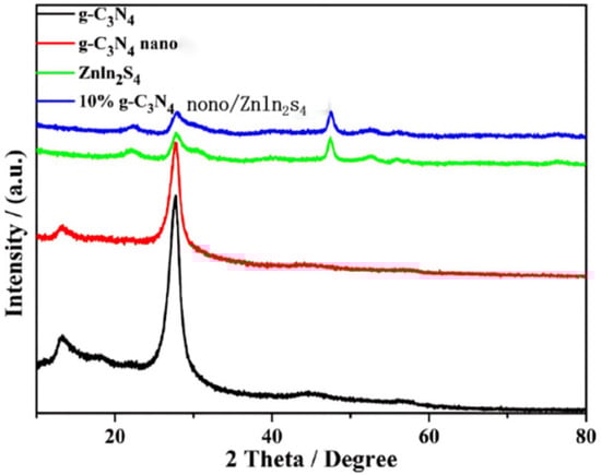 XRD patterns of g-C3N4, nano g-C3N4, ZnIn2S4, and 10% nano g-C3N4/ZnIn2S4.