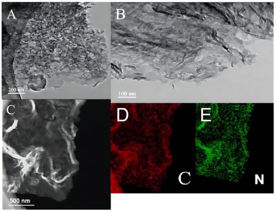 (A) TEM image of g-C3N4, (B) TEM image of nano g-C3N4, (C) dark-field image, and (D,E) mapping of nano g-C3N4.