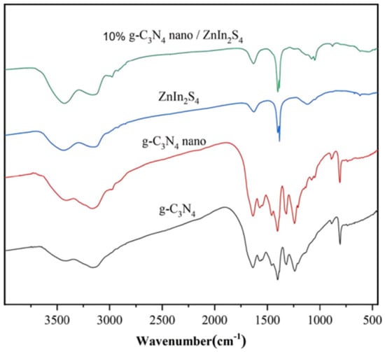 FTIR spectra of g-C3N4, nano g-C3N4, ZnIn2S4, and 10% nano g-C3N4/ZnIn2S4.