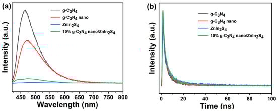 (a) Steady-state photoluminescence spectra of different samples. (b) Time-resolved photoluminescence decay spectra of g-C3N4, nano g-C3N4, ZnIn2S4, and 10% nano g-C3N4/ZnIn2S4.
