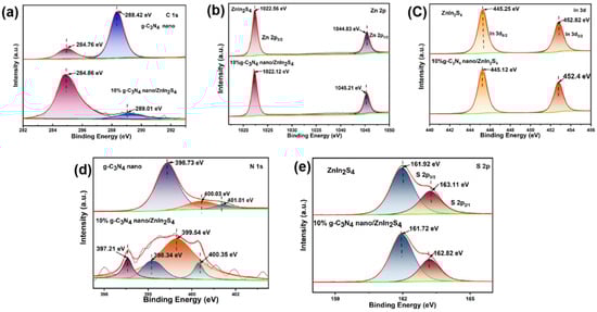 XPS further confirmed the composition of the 10% nano g-C3N4/Znln2S4 sample. Figure 7a shows that the C 1s spectrum of nano g-C3N4 has two characteristic peaks located at 288.42 and 284.76 eV. These peaks correspond to the sp2-hybridized carbon-containing defects (N-C=N) and graphitic carbon in the carbon-containing aromatic ring of the sp2 bonds (C-C, C=C). Typically, the C 1s peak at 284.76 eV originates from carbon-based impurities, which are generated during high-temperature treatment [27,28,29]. This impurity peak increases in intensity as the amount of cyanuric acid increases [30]. Figure 7b shows that the Zn 2p XPS spectrum of Znln2S4 has two significant peaks located at 1022.56 and 1044.83 eV, which correspond to Zn 2p3/2 and Zn 2p1/2, respectively, while the 10% Zn 2p1/2 peaks are located at 1022.56 and 1044.83 eV, respectively. Meanwhile, the Zn 2p characteristic peaks corresponding to nano 10% g-C3N4/Znln2S4 show a slight shift to 1022.12 and 1045.21 eV, respectively. Similarly, Figure 7c shows that the In 3d spectra of Znln2S4 has two characteristic peaks located at 445.25 and 452.82 eV, which correspond to In 3d5/2 and In 3d3/2. Similar to the above, the positions of the In 3d peaks corresponding to 10% nano g-C3N4/Znln2S4 show a small decrease, shifting to 445.12 and 452.4 eV, respectively. In addition, the N 1s spectrum of nano g-C3N4 shown in Figure 7d reveals three characteristic peaks at 401.01, 400.03, and 398.73 eV, which correspond to the amino group (C-N-H), the tertiary nitrogen N-(C)3 group, and the sp2-bonded N (C-N=C), respectively [31,32]. Notably, both the N 1s and C 1s characteristic signals of nano g-C3N4 were slightly shifted to higher binding energies after forming a heterojunction with the ZnIn2S4 nanosheets, which could be attributed to the transfer of some of the electrons from the N and C to the S of ZnIn2S4. In addition, the observed peak at 397.21 eV in the N 1s spectrum of 10% nano g-C3N4/Znln2S4 may be related to the N-S bonding, which further proves the existence of a strong interfacial interaction between nano g-C3N4 and ZnIn2S4 [33]. Figure 7e shows that the binding energies of S 2p3/2 and S 2p1/2 are located at 161.92 and 163.11 eV, respectively, which are related to S2− in Znln2S4 [34]. Similarly, the binding energies at 161.72 and 162.82 eV of 10% nano g-C3N4/Znln2S4 are lower than those of Znln2S4. Both the binding energy and the peak intensities of S 2p in 10% nano g-C3N4/Znln2S4 become smaller, and, theoretically, the increase in the binding energy is attributed to the decrease in the electron density, resulting in a weakening of the electron shielding effect. On the contrary, the electron density increase leads to a decrease in the binding energy, which is due to the enhancement of the electron shielding effect [35].