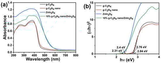 (a) UV–Vis diffuse reflectance spectra of g-C3N4, nano g-C3N4, Znln2S4, and 10% nano g-C3N4/Znln2S4; (b) band gaps of g-C3N4, nano g-C3N4, Znln2S4, and 10% nano g-C3N4/Znln2S4.