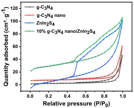 Using N2 adsorption–desorption isotherms, the specific surface areas and pore size distributions of the g-C3N4, nano g-C3N4, ZnIn2S4, and 10% nano g-C3N4/ZnIn2S4 composites were studied. Table 1 shows that the average pore sizes of these materials were 20.05 nm, 19.1 nm, 10.56 nm, and 9.79 nm, respectively, indicating that the ZnIn2S4 and the composite had smaller pore sizes, and the average pore size was reduced due to the increase in mesopores. In terms of the specific surface area, 10% nano g-C3N4/ZnIn2S4 exhibited the largest specific surface area of 90.57 m2/g, which is beneficial for increasing the contact area with pollutants and promoting photocatalytic reactions. Additionally, the pore volumes of these materials were 0.07 m3/g, 0.09 m3/g, 0.18 m3/g, and 0.24 m3/g, respectively. An increase in the pore volume helps to enhance the adsorption capacity of the catalyst, thereby accelerating the catalytic degradation of pollutants. Figure 9 presents the adsorption–desorption isotherms of g-C3N4, nano g-C3N4, ZnIn2S4, and 10% nano g-C3N4/ZnIn2S4. All samples exhibited characteristic IV adsorption isotherms with H3 hysteresis loops, indicating the presence of mesoporous structures.