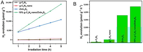 Figure 10 shows the photocatalytic hydrogen production of the different samples under visible light illumination for 5 h, as well as the rate of hydrogen production. It can be seen that the hydrogen production of both the g-C3N4 and the g-C3N4 nanosheets was low and negligible compared to that of the ZnIn2S4 and 10% nano g-C3N4/ZnIn2S4. This was due to the high recombination rate of the photogenerated carrier in the graphene-like layered structure of g-C3N4. The 10% nano g g-C3N4/ZnIn2S4 sample material, obtained by loading 10% g-C3N4 nanoflakes onto the ZnIn2S4 semiconductor material, possessed a relatively high hydrogen yield. In Figure 6B, it can be seen that the hy-drogen yield of g-C3N4 was 32.7372 μmol g−1 h−1, whereas that of the 10% g-C3N4/ZnIn2S4 nanohybrid junction photocatalytic material was as high as 4772.6404 μmol g−1 h−1, which is equivalent to 100 times that of the g-C3N4 photocatalytic material. This also means that the 10% g-C3N4/ZnIn2S4 nano-heterojunction prepared in this ex-periment possessed high photocatalytic activity. This is due to the fact that the hetero-junction structure formed by the composite of g-C3N4 and ZnIn2S4 semiconductors effectively inhibits the recombination of photogenerated carriers, thus improving the photocatalytic performance of the material to a large extent.