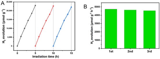 Based on the above experiments and analyses, it is clear that the 10% g-C3N4/ZnIn2S4 nanohybrid junction composites prepared in this experiment can effectively improve the photocatalytic activity. However, in real life and production, developing materials with high catalytic activity is only one of the goals of our research; their practicality is an indicator that we cannot ignore. Therefore, while pursuing high catalytic activity, we should also ensure that the prepared photocatalytic materials have a long life and stability. In this experiment, we also investigated the stability of the 10% g-C3N4/ZnIn2S4 nano-heterojunction composite photocatalytic materials for hydrogen production, as shown in Figure 11A,B. After three cycles of experimental testing, with 5 h of irradiation each time, the test results show that the catalytic activity of the sample catalysts did not decrease significantly during the test, which indicates that the 10% g-C3N4/ZnIn2S4 nano-heterojunction composite photocatalytic materials prepared in this experiment have a long life and stability. The ZnIn2S4 nano-heterojunction catalytic material did not decompose under visible light irradiation and still maintained its high catalytic activity, which also strongly verifies that the composites prepared in this experiment have high stability and reusability.