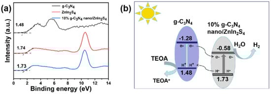 The Schottky barrier formed at the metal/semiconductor interface promotes electron–hole separation in photocatalysis, while the metal acts as an electron sink. The photoinduced electrons in noble metals and holes in the VB of semiconductors participate in subsequent redox reactions. The whole process increases the charge carrier lifetime and improves the photocatalytic activity. The unique localized surface plasmon resonance (LSPR) of noble metal NPs can boost photocatalytic activity by increasing the incoming photon absorption. Furthermore, the facile tunability of LSPR (i.e., by adjusting the size and shape) allows for a broad spectrum of light absorption [36]. Conduction band (CB) potentials of −0.58 and −1.28 V (relative to the NHE) were calculated for 10% nano g-C3N4/Znln2S4 and g-C3N4, respectively, based on the equation ECB = EVB − Eg, according to the bandgap energy data map in Figure 12. The energy band alignment in the figure indicates that the ECB of g-C3N4 was more negative than that of 10% nano g-C3N4/Znln2S4, while the EVB position of 10% nano g-C3N4/Znln2S4 was below that of g-C3N4. Due to the energy matching between 10% nano g-C3N4/Znln2S4 and g-C3N4, the transfer of the photogenerated holes or electrons between the two semiconductors is considered a type II heterostructure mechanism. Under visible light irradiation, 10% nano g-C3N4/Znln2S4 and g-C3N4 were excited and produced electron–hole pairs. The photoinduced electrons were transferred from the CB of g-C3N4 to the CB of 10% nano g-C3N4/Znln2S4 through the tight two-dimensional heterojunction interface, and then H+ was reduced to H2. Photogenerated holes at the VB energy level of 10% nano g-C3N4/Znln2S4 can be spontaneously injected into the VB energy level of g-C3N4. In addition, due to the two-dimensional structure of the ultrathin g-C3N4 and 10% nano g-C3N4/Znln2S4, the photoinduced carriers are able to migrate rapidly to the surface for efficient subsequent reactions. Compared to ZnIn2S4 and g-C3N4 alone, the proper arrangement of the energy band structures in the composites facilitates the separation of photoinduced carriers and thereby promotes photocatalytic H2 release.