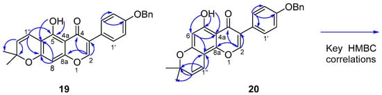 Since the NMR data of 3-(4-(benzyloxy)phenyl)-5-hydroxy-8,8-dimethyl-4H,8H-pyrano[2,3-f]chromen-4-one (19) and (4-(Benzyloxy)phenyl)-5-hydroxy-8,8-dimethyl-4H,8H-pyrano[2,3-f]chromen-4-one (20) have not been reported yet; the distinction between the two compounds was challenging and may lead to misassignment due to their structural similarity. We therefore employed 2D NMR spectroscopy to unequivocally confirm the structures of 19 and 20. The HSQC data established all 1J (1H-13C) connectivities (see the Supplementary Materials), and the key HMBC correlations are shown in Figure 2. The HMBC spectra of 19 showed a correlation of 5-OH [δH 13.18] with C-6 [δC 105.0], while there was no correlation of 5-OH with the tertiary carbon atom [C-8 (δH 6.34, δC 93.8)], suggesting that 19 is a linear isomer. The HMBC correlations between 5-OH [δH 12.95] with C-4a [δC 105.0] and tertiary carbon C-6 [δH 6.30, δC 99.3] of 20 indicated that it was an angular isomer.