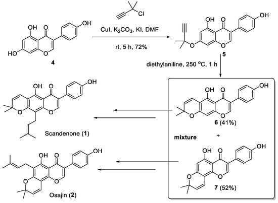 - Wang, R.; Ma, R.; Feng, K.; Lu, H.; Zhao, W.; Jin, H. Total synthesis and anti-inflammatory evaluation of osajin, scandenone and analogues. Pharmaceuticals 2024, 17, 86. [Google Scholar] [CrossRef]