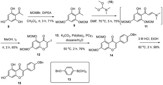 As shown in Scheme 2, we started our synthesis to afford natural compounds 1–3 by making a known intermediate, 3-iodochromone 12 [24]. Using previously published procedures, the selective protection of two hydroxyl groups in 8 with methoxymethyl bromide (MOMBr) and N,N-Diisopropylethylamine (DIPEA) provided MOM ether 9 (71%) [25], which was treated with dimethylacetal (10) in DMF to furnish enamino ketone 11 (75%). Enaminone 11 was subsequently subjected to intramolecular cyclization using I2 in MeOH at rt to give 3-iodochromone 12 (65%). We then utilized a palladium-catalyzed Suzuki reaction with 12 and phenylboronic acid 13 to give the desired isoflavone 14 in 76% yield [26,27]. Removal of the MOM groups of 14 provided the desired 5,7-dyhydroxyl-isoflavone derivative 15 in 98% yield [25].