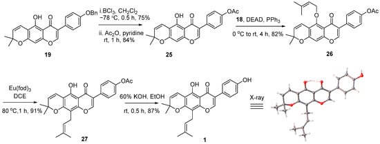 Since selective debenzylation is difficult in the presence of both pyran and isopentene groups, the benzyl group in 19 was removed and replaced by the acetyl protecting group to give compound 25, which was then subjected to condensation with 18 under typical Mitsunobu conditions using triphenylphosphine (PPh3) and diethyl azodicarboxylate (DEAD) to obtain 26 (Scheme 3). Compound 26 was subjected to a europium(III)-tris(1,1,1,2,2,3,3-heptafluoro-7,7-dimethyl-4,6-octanedionate) [Eu(fod)3]-catalyzed aromatic para-Claisen-Cope rearrangement conditions to afford 27 (91%) [34]. Deprotection of the -Ac group with 60% KOH in EtOH completed the synthesis of scandenone (1) (87%), the structure of which was confirmed by single-crystal X-ray analysis (see the Supplementary Materials). Our X-ray analysis data was in line with previously published results [14].