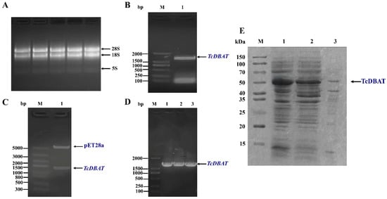 Cloning and heterologous expression of TcDBAT. (A) Total RNA of Taxus chinensis needles. (B) PCR amplification of TcDBAT. (C) Identification of pET28a-TcDBAT by double enzyme digestion. (D) Colony PCR identification of pET28a-TcDBAT. (E) SDS-PAGE analysis of recombinant TcDBAT after IPTG induction expression. M: marker; 1: whole cell; 2: supernatant after cell disruption; 3: precipitate after cell disruption.